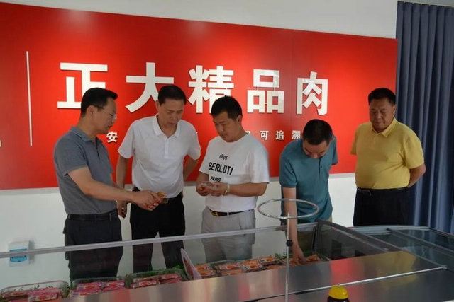 刘长河会长一行首先通过参观走廊参观了洛阳正大生猪屠宰、分割加工、肉类食品深加工生产线及产品体验中心,参观结束后到公司三楼会议室进行交流座谈。